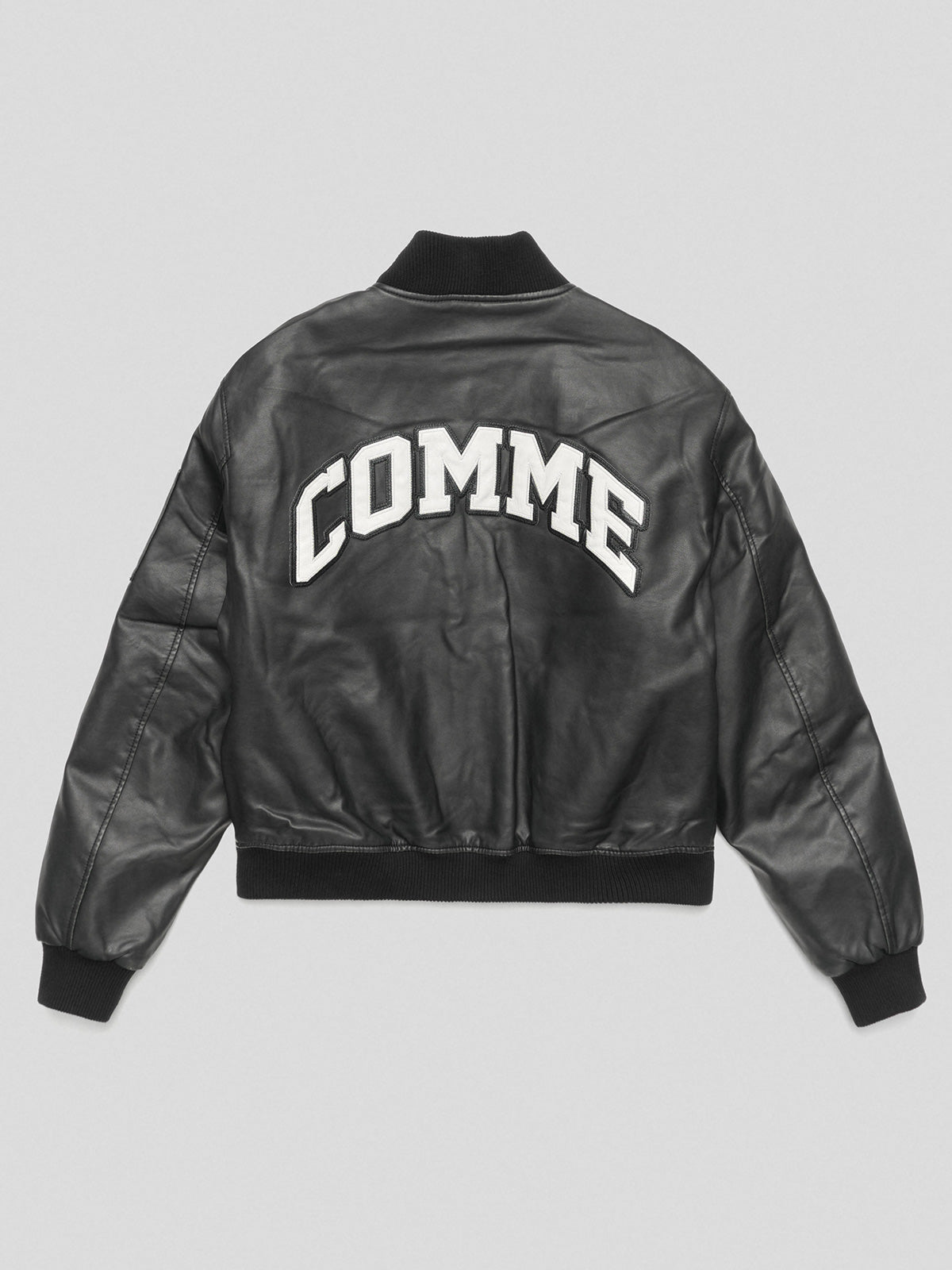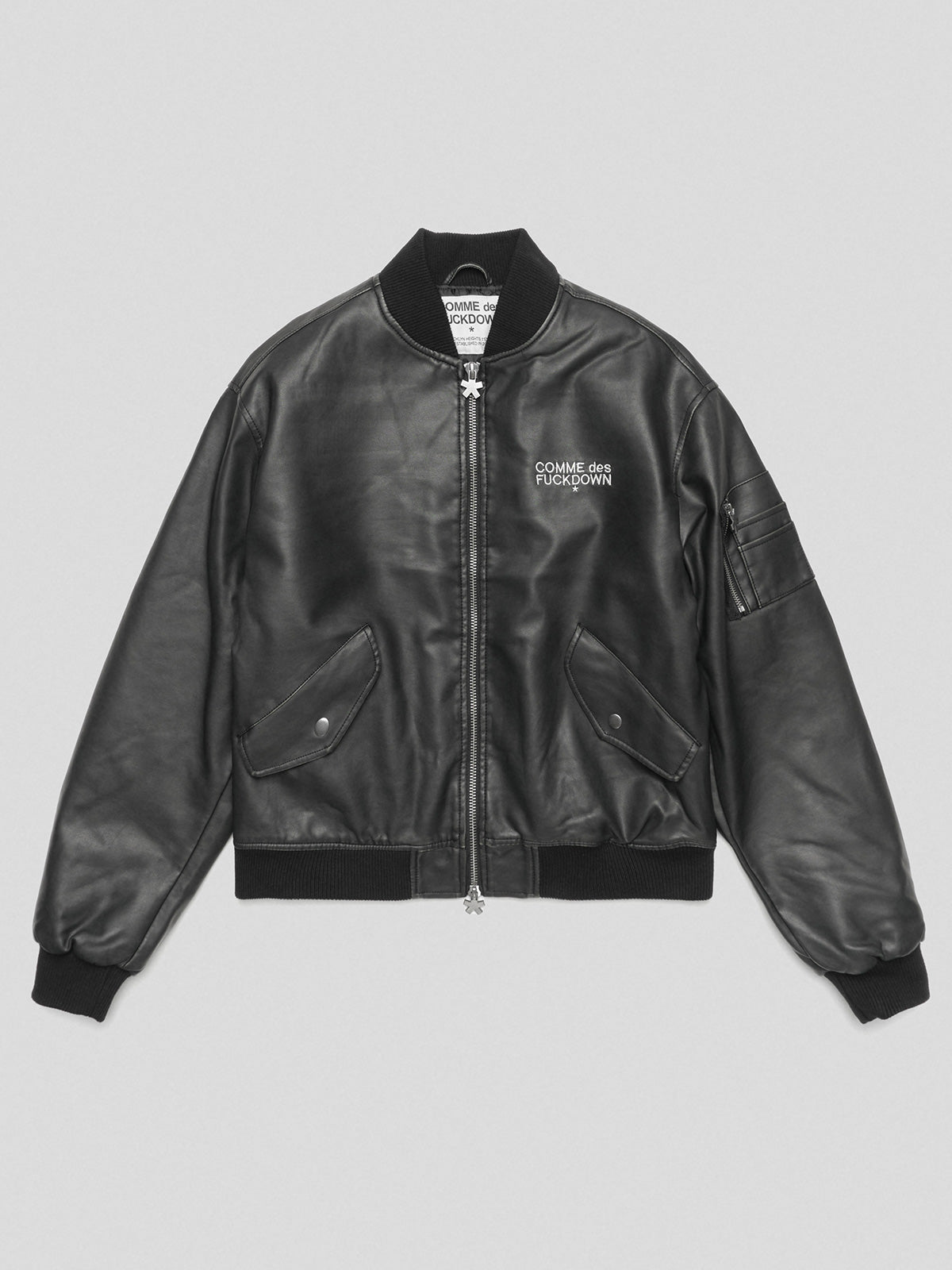 Faux Leather Bomber Jacket with Embroidery and Patches • Black